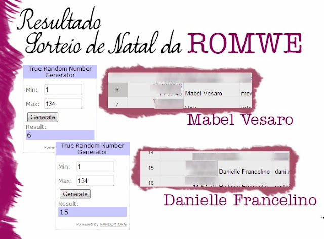 E as sorteadas são … Parabéns meninas, em breve a Romwe entrará em contato com vocês, então fiquem de olho em seus e-mails. Related PostsOcéane Femme – Lixa para unhas.ESMALTES BEAUTY COLOR – MISTURA BRASILEIRAOMG! Primeira loja de Dolce & Gabbana no Brasil é aberta em 2012!Esmalte: Cheesecake, HitsLook de Emma Watson Compartilhe...FacebookTwitterPinterest