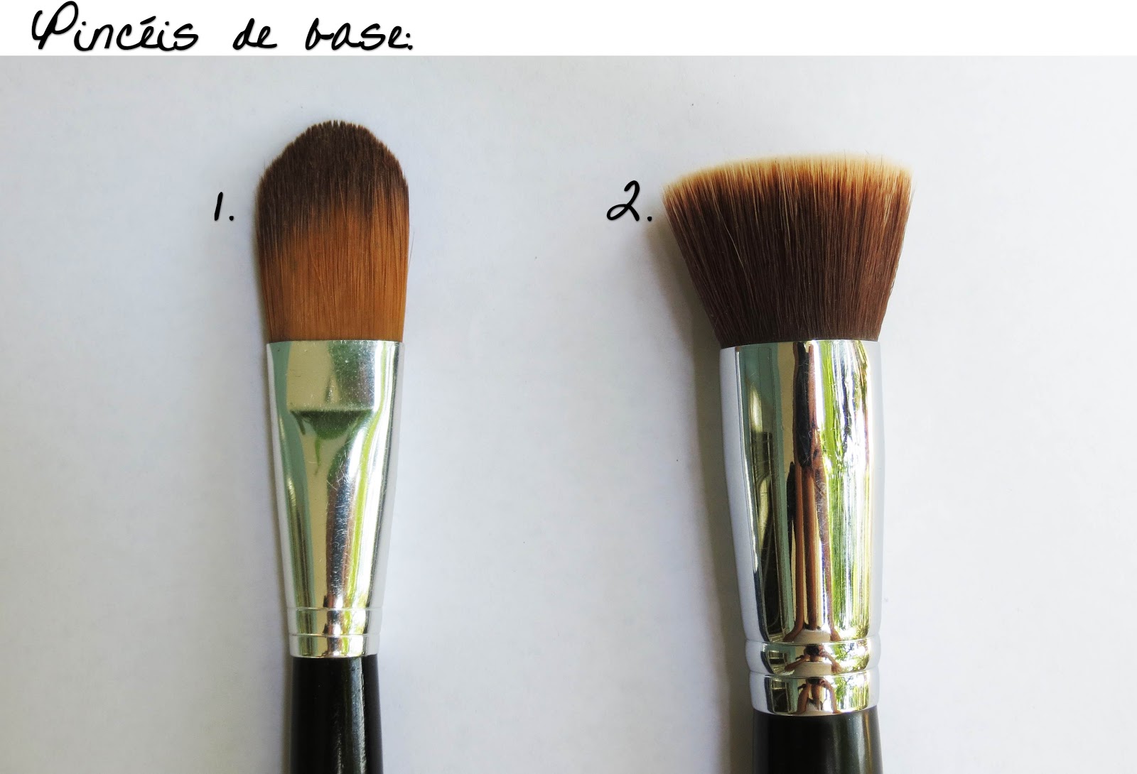Eu acho importante você ter um pincel de base, mas se a base for liquida também pode ser aplicada com a mão, e dá um efeito bem mais natural. 1. O famoso pincel lingua de gato é muito bom para passar base liquida(mas preste sempre atenção se ele não deixou risquinho na sua da base na sua pele). 2. Já o pincel kabuki(que tem este corte reto) é ótimo para passar qualquer tipo de base, tanto liquidas, como em pó, ou mousse, e não deixa risquinhos na pele. Pra mim ele é o melhor pincél para aplicar base.